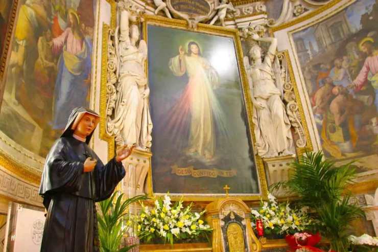 statua suor faustina kowalska e quadro di gesù misericordioso
