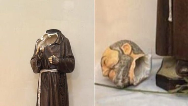 statue di padre pio e della madonna decapitate